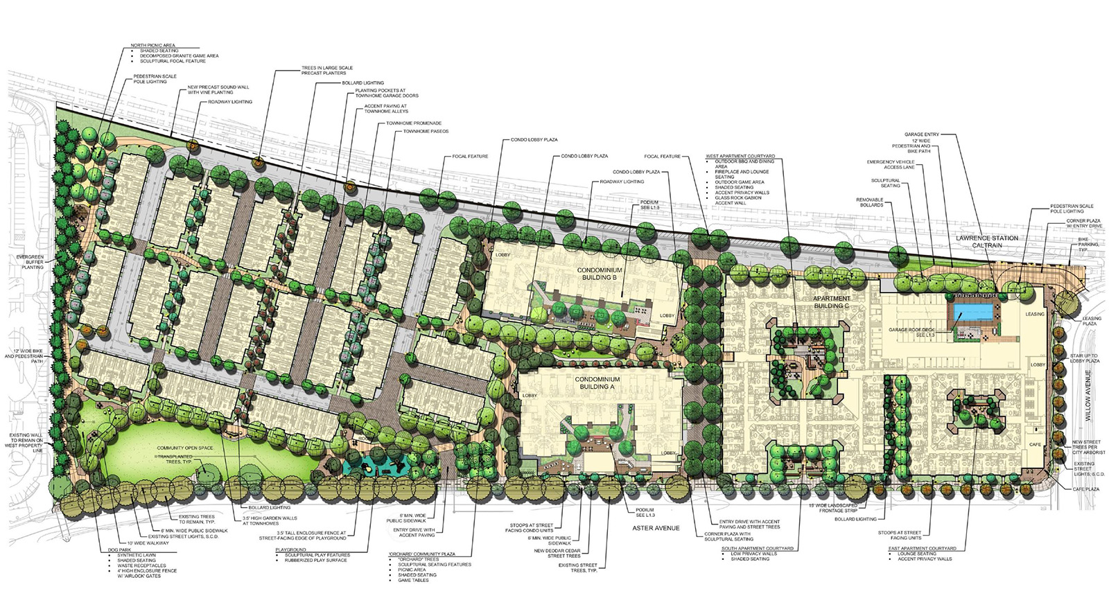 17-acre Master Plan development located directly adjacent to the Lawrence Caltrain Station in Sunnyvale, CA. Olympic worked with the landowner to redevelop the site for new ownership and rental housing, and to enable better usage of transit in accordance with the Lawrence Station Area Plan. The site programming incorporates significant community open space and bicycle & pedestrian corridors, promoting walkability and active connections between the various uses. Olympic successfully entitled the Master Plan in February 2019. The apartment project, now known as Hartwood, was completed in December 2024.